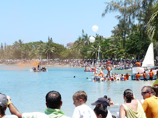 Le principe est simple : fabriquer une embarcation à l'aide de barils ainsi que les rames; attention : moteur interdit ! et que le meilleur gagne !! l'ambiance est extraordinaire, Thierry a réalisé un film, je vais essayer de le charger sur facebook (chercher véronique daubord). Il compte bien participer l'année prochaine, les particuliers ne peuvent pas s'inscrire alors il veut motiver le club de Dumbéa Natation pour le suivre dans cette aventure ....A suivre.....